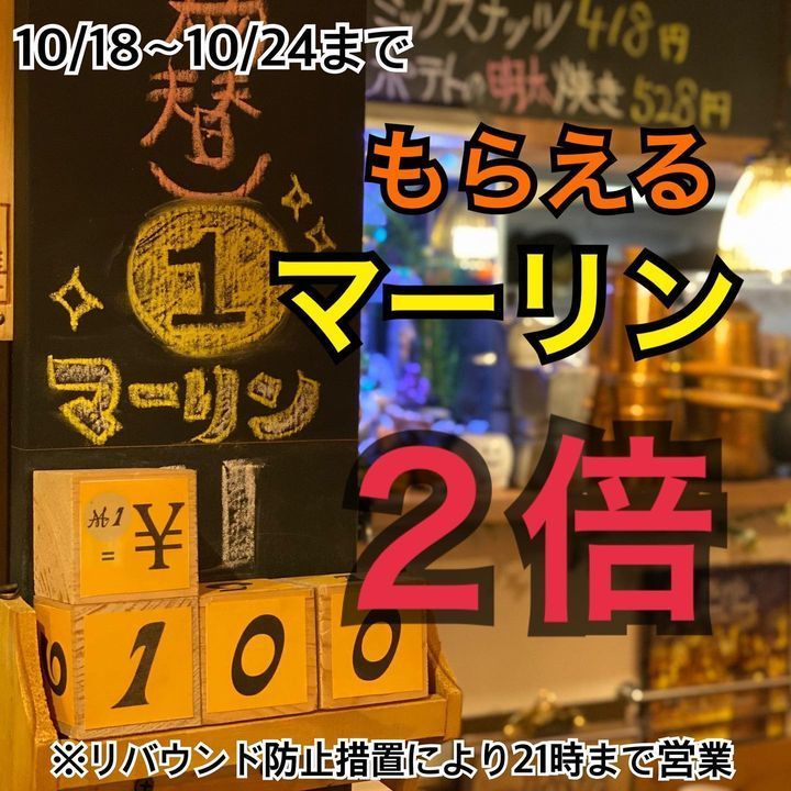 明日からリバウンド防止期間となっている24日までは21時までの営業となりますが、この期間にご来店の皆様にはマーリンコインを2倍にしてお配り致します💰🤩💰